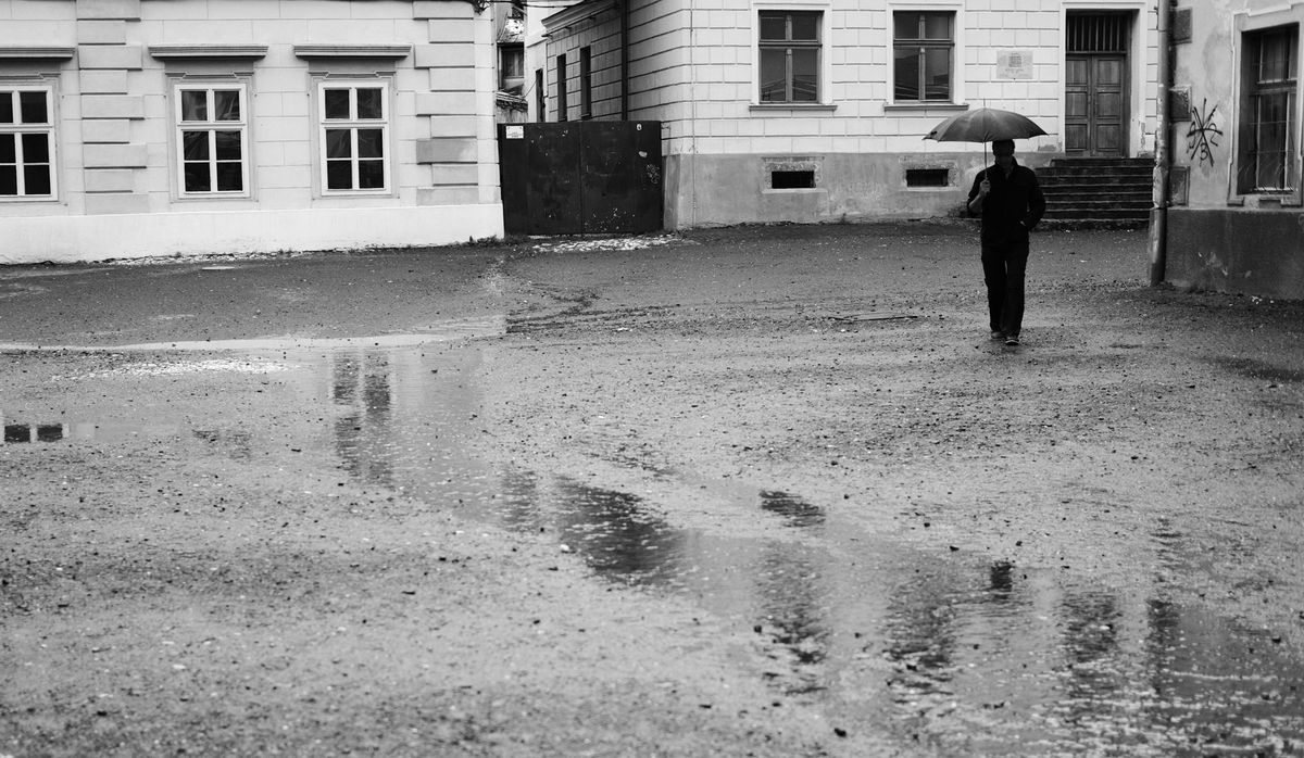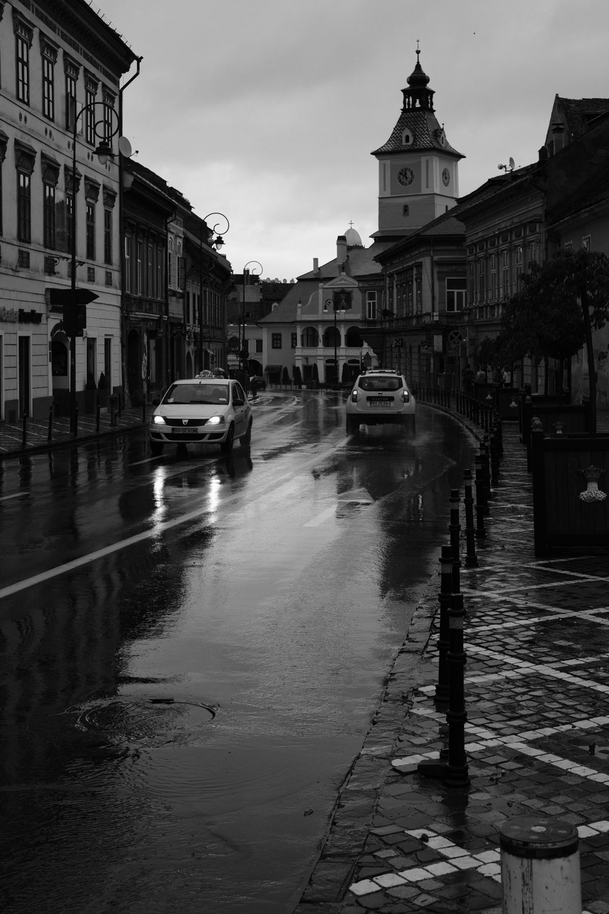 We caught a very rainy day in Brasov, which made for some very interesting photographs. Rain always adds contrast because it creates highlights where there weren’t any (for example, water on the road reflects light, creating white spots on photographs), and most colors are darkened, causing deeper shadows. This, in turn, increases the difference between the lightest and darkest points of the image, increasing contrast.